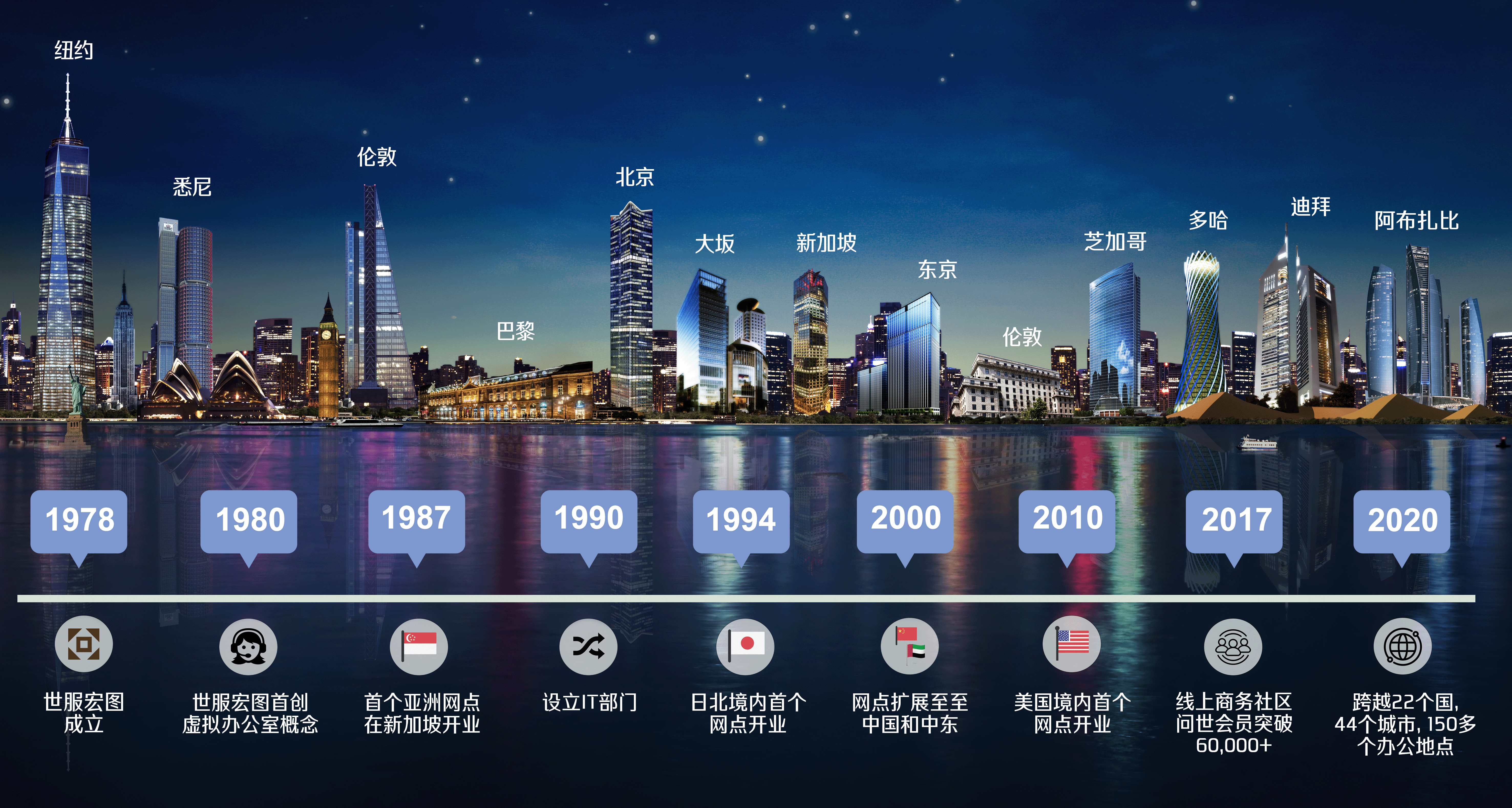 公司创始人兼首席执行官 Alf Moufarrige 先生于1978 年在澳大利亚悉尼注册并成立世服宏图。作为服务式办公室和虚拟办公室行业的开拓者,他在灵活办公领域深耕逾 45 年。值得一提的是,世服宏图正是 30 多年前虚拟办公室的发源地。公司自1987年起走向全球,目前已在全球 19 个国家、40 个城市设有 150 多个办公地点。